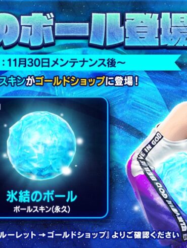 氷結のボール登場 開催期間:11月30日メンテ後~ 新たなボールスキンがゴールドショップに登場! ゴールデンボール×1で「氷結のボール(ボールスキン)」と交…