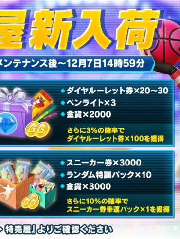 \特売屋新入荷/ 開催期間:11月23日メンテナンス後~12月7日14時59分 今週の特売屋には「ダイヤルーレット幸運パック」「スニーカー券幸運パック」が入…
