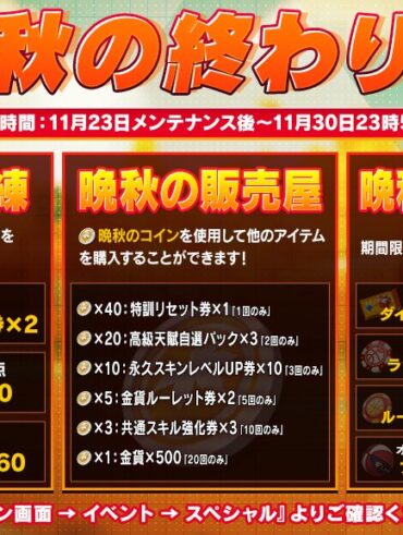 秋の終わり 開催期間:11月23日メンテ後~11月30日23時59分 晩秋の訓練 任務クリアで報酬をGET! 晩秋の販売屋 「晩秋のコイン」でアイテムの交…