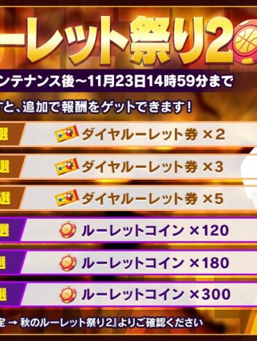 秋のルーレット祭り2 開催期間:11月16日メンテナンス後~11月23日14時59分 ルーレットを回すと、追加で「ダイヤルーレット券」や「ルーレットコイン」な…