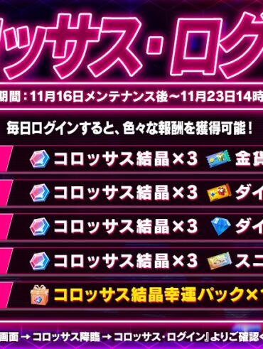 コロッサス・ログイン 開催期間:11月16日メンテナンス後~11月23日14時59分 期間中、毎日ログインすると「コロッサス結晶」と「金貨ルーレット券」等の…