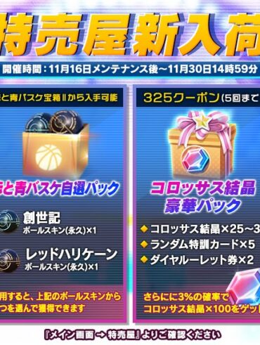 \特売屋新入荷/ 開催期間:11月16日メンテナンス後~11月30日14時59分 今週の特売屋には「赤と青バスケ宝箱II」「赤と青バスケ自選パック」「コロッ…