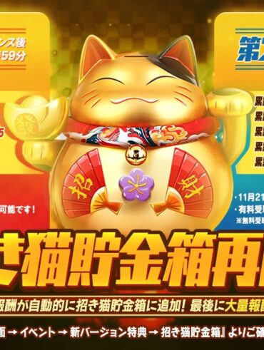 「招き猫貯金箱」再開 開催期間:11月9日メンテナンス後~11月15日23時59分 新バージョンアップデートと共に、招き猫貯金箱も再開! 毎日招き猫の任務を…