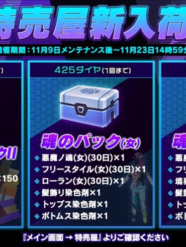 \特売屋新入荷/ 開催期間:11月9日メンテナンス後~11月23日14時59分 今週の特売屋には「豪華スキンレベルUP券パックII」「魂のパック(女)」「魂…